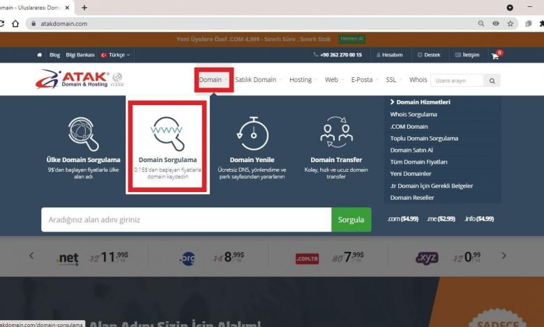 - Açılan sayfa içerisinde sorgulama işlemlerini sağlamanız için üst kısımda yer alan domain menüsünün içerisinde domain sorgulama butonuna tıklayabilirsiniz.